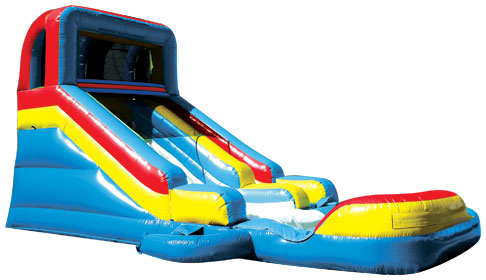 The Slide N' Splash with Detachable Pool is a wet/dry slide any indoor even or warm outdoor party as a great way to cool off. This wet/dry slide allows riders to climb 14 feet to a No-Jump Top, which forces players to slide down correctly, keeping them secure. Kids climb up a right-sided climb to a wide left-sided slick slide, into an oversize, safety-ended pool that detaches, making the transition from a dry to wet slide quick and easy. A brightly-colored theme completes the Slide N' Splash look, ready to fit in to any celebration. This wet or dry slide is just one of the many amazing inflatable slides.